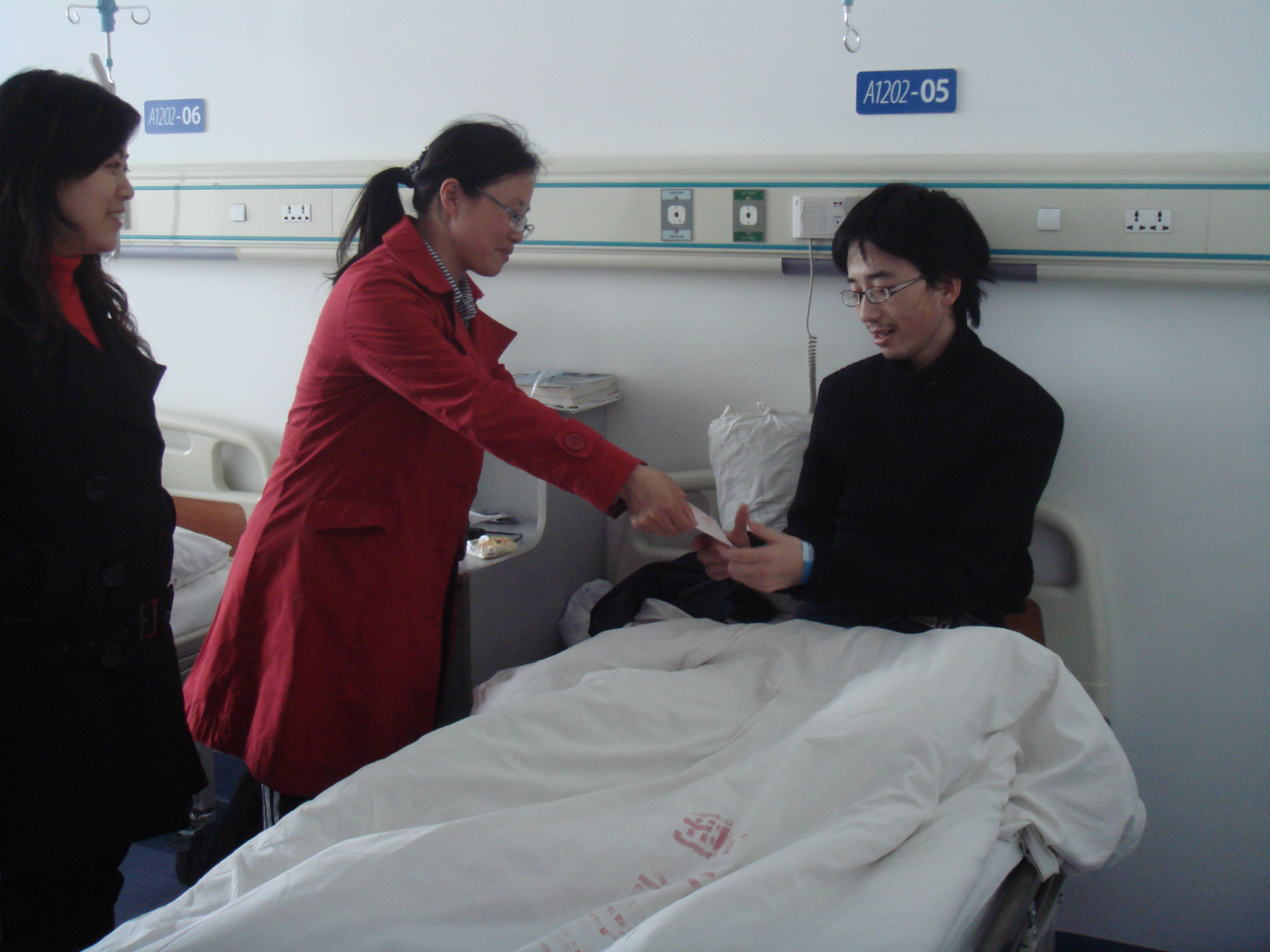 4月20日,威廉希尔官网“春雨基金”负责同学到南汇中心医院慰问因阑尾炎手术住院的2005学生李华夏。4月17日晚来自甘肃的李华夏同学因突发急性阑尾炎被送至南汇中心医院救治,远在老家的父母不能到医院照顾他。得知这一情况,“春雨基金”立即拨出500元慰问金并购买了营养品。计信学院党总支副书记王佳丽老师亲自将慰问金送到李华夏同学手中,并希望他能安心养病,祝他早日康复!辅导员叶涵敏老师也一同前往医院慰问。