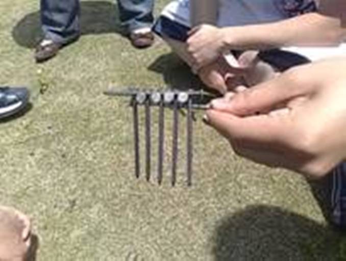 在活动中,同学们分为几个小组,讨论如何只用一颗钉子顶起10颗钉子的游戏。在讨论、探究的过程中,大家都努力思考,本着“世上无难事,只怕有心人”的信念,经过一次次的尝试,最终在实践中找到了正确的破解之道。