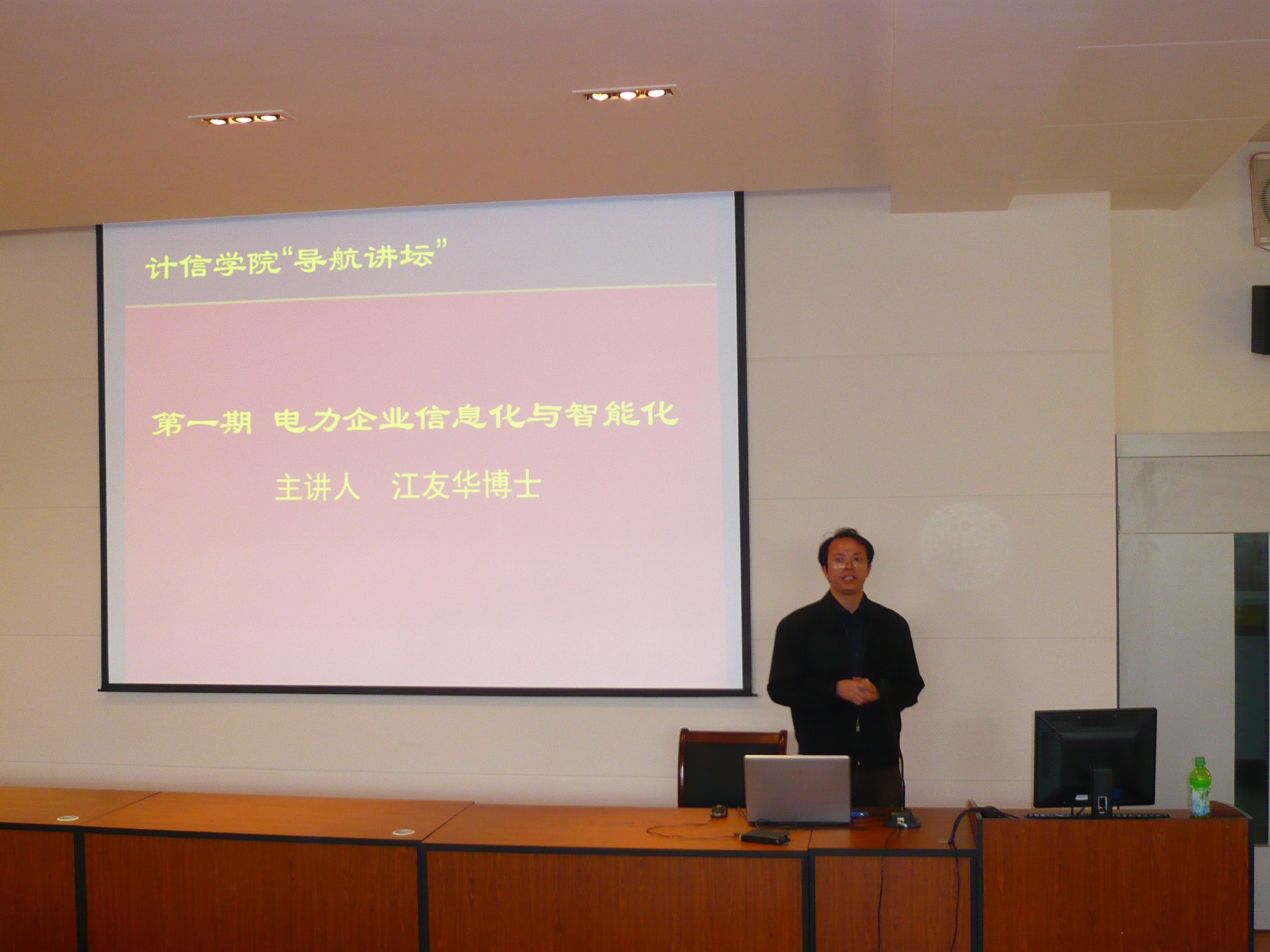 随后,威廉希尔官网副教授江友华博士作为首位讲坛嘉宾为同学们带来了题为“电力企业信息化与智能化”的讲座。江博士结合代表当今世界电力系统发展变革最新方向的智能电网对电力企业信息化的现状和智能电网的产生及其面临的问题做了深入浅出的分析。他还通过节能用电管理系统的实例使同学们对智能电网有了一个较直观的认识。最后,他针对如何应对电力技术体系的根本性变化指出我们在电力企业信息化方面应该采取的行动策略并给出了相关建议。