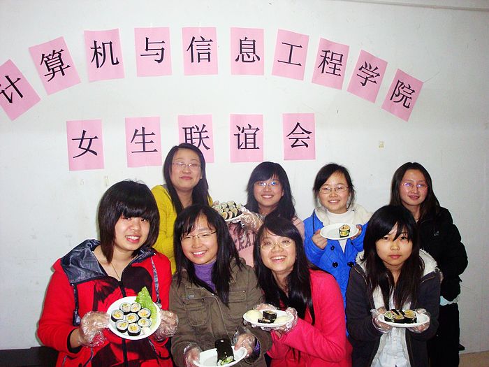 活动开始,各班女生首先做了自我介绍,增进彼此的了解。之后,大家一起动手做寿司和水果沙拉。在互帮互助中,气氛逐渐融洽。成果出来后,请到场的数位男生代表品尝后纷纷赞不绝口。劳动过后的趣味小游戏更是把此次活动推向了高潮。最后辅导员总结活动,幽默的言语也让师生关系达到了另一个高度。