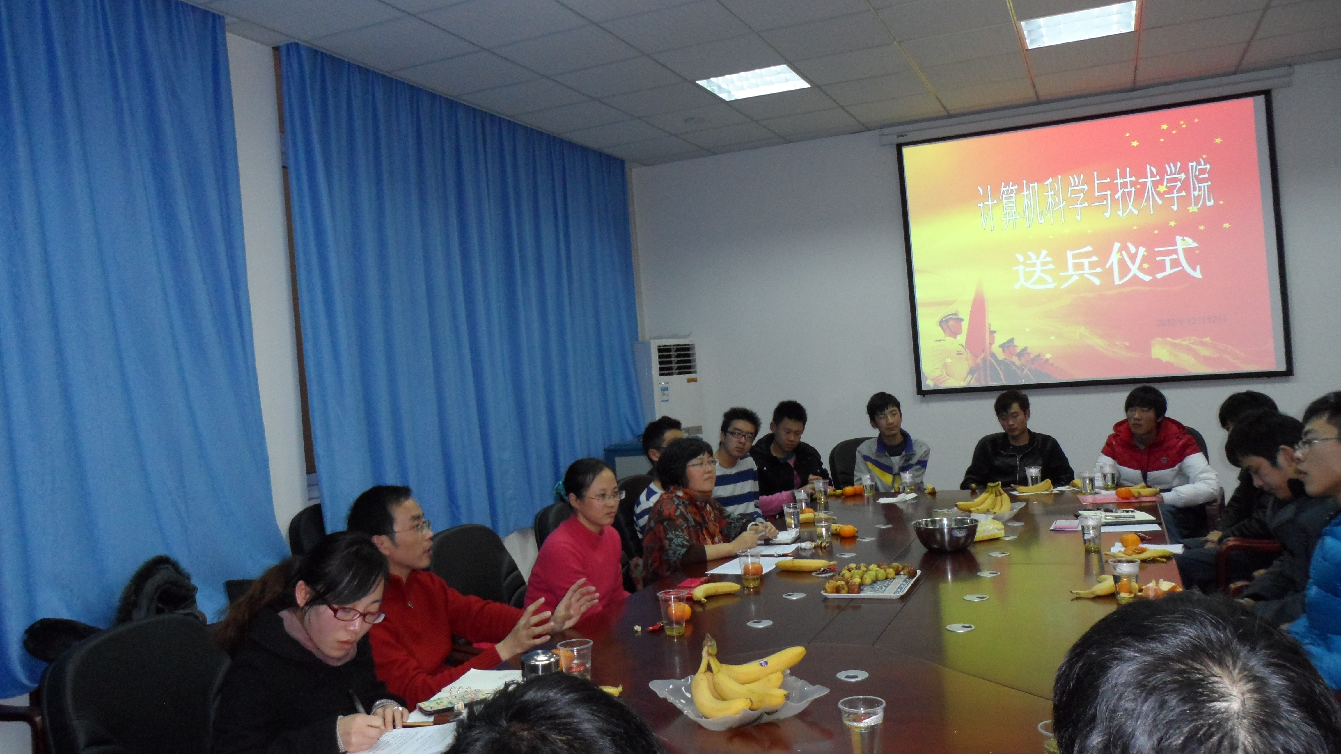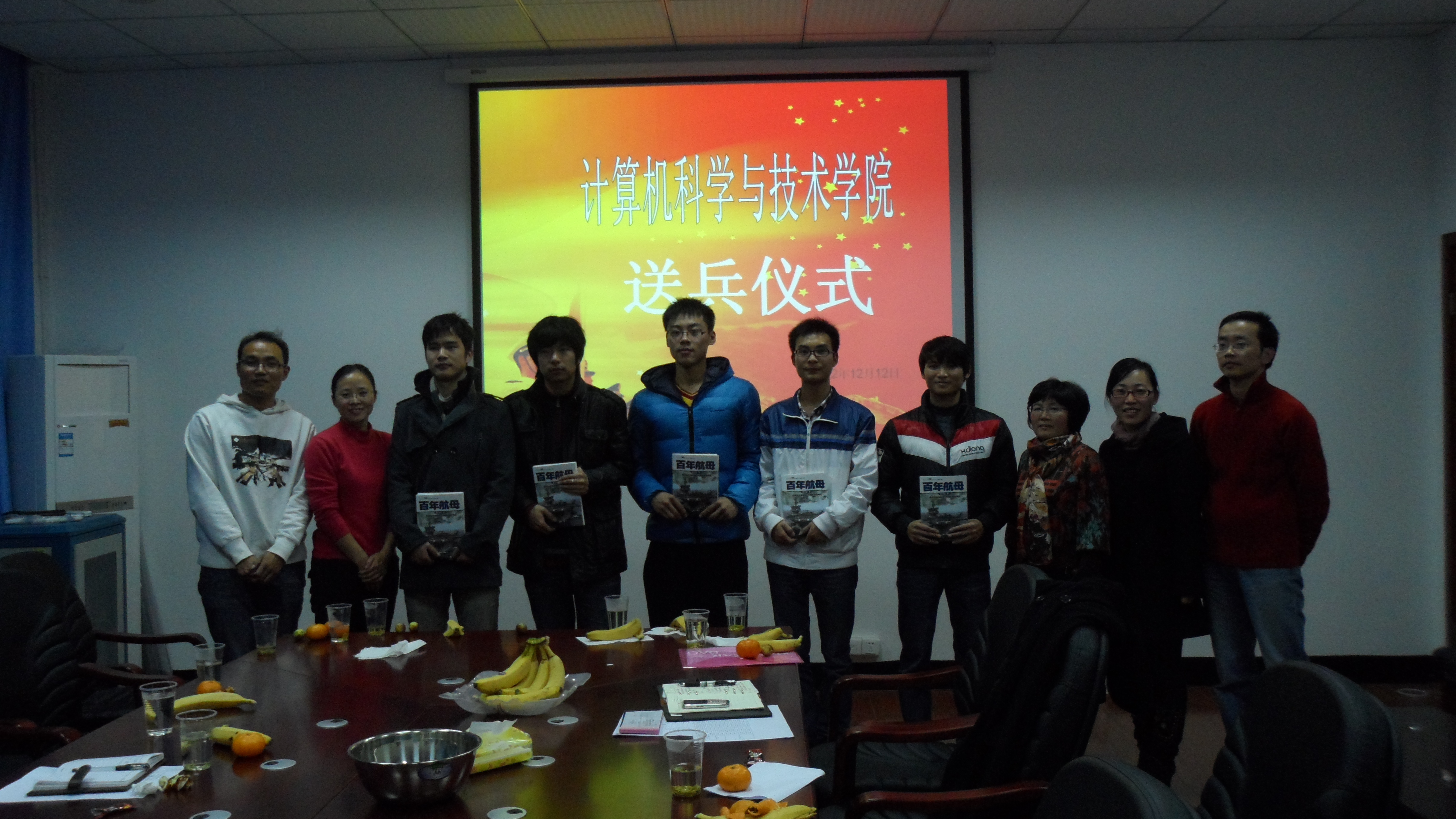 12月13日,学院会议室气氛隆重而热烈。威廉希尔官网2012年送兵仪式在此举行,学院党总支书记张仙智老师、副院长毕忠勤老师和党总支副书记王佳丽老师、辅导员陈雯老师以及新兵班级同学好友出席会议。学院负责征兵事务的辅导员赵铮老师主持会议。