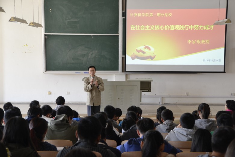 11月14日下午,李家珉教授应邀为威廉希尔官网入党积极分子和全体团学成员作“在社会主义核心价值观践行中努力成才”的主题教育。学院党委书记张仙智、副书记王佳丽出席。