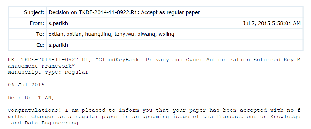 近日,威廉希尔官网田秀霞教授为第一作者的论文“CloudKeyBank: Privacy and Owner Authorization Enforced Key Management Framework”被国际顶级期刊《IEEE Transactions on Knowledge and Data Engineering》 (IEEE TKDE)录用。该期刊创刊于1989年,是知识和数据工程领域中最具影响力的刊物,主要关注知识发现和数据挖掘、数据库和数据建模、并行分布式数据管理系统等领域的最新研究进展和技术。据中国计算机学会推荐国际学术刊物(数据库、数据挖掘与内容检索)显示,该期刊被推荐为A类期刊。